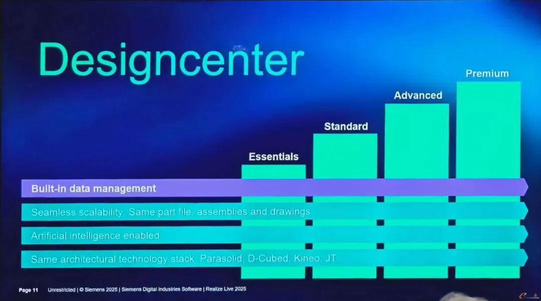 Designcenter的定位十分清晰——成为西门子Xcelerator中连接设计与仿真的核心枢纽。它采用独特的可扩展架构,提供Essentials、Standard、Advanced和Premium等不同版本,满足从中小企业到大型跨国企业的不同需求。