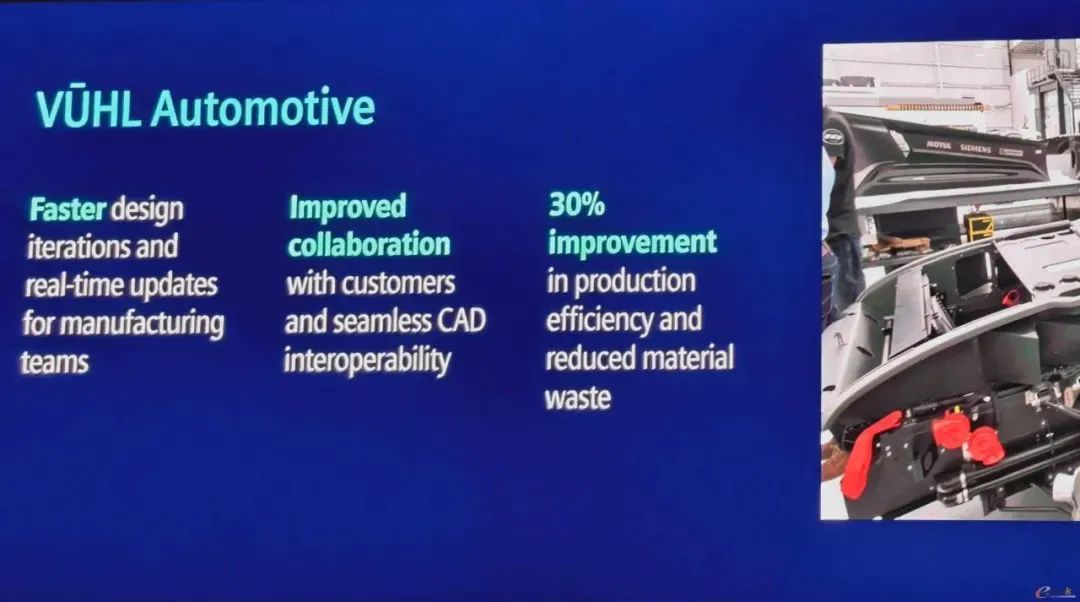 Joe Bohman介绍,这一工作流程在VUHL Automotive等项目中已经得到验证,Designcenter展现了其打破协作壁垒的显著价值。通过为VUHL Automotive制造团队提供实时设计更新和快速迭代能力,大幅缩短了从设计到生产的周期时间。更关键的是,Designcenter实现了与供应链合作伙伴的无缝CAD互操作性,使客户能够直接参与设计评审与优化过程,消除了传统协作中的数据转换障碍。最终,这种集成化工作模式不仅提升了30%的生产效率,还通过精确的数字样机和仿真分析显著减少了材料浪费。
