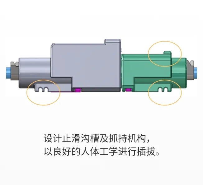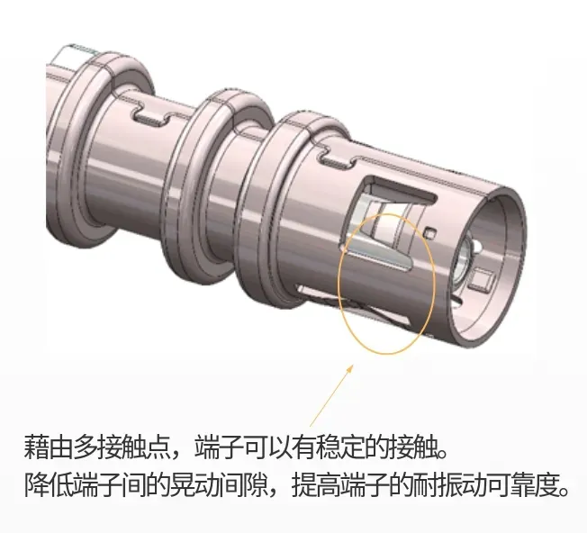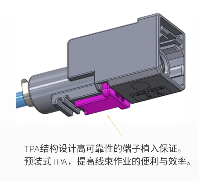 ★自锁卡扣设计: 在实现良好的人体工学状态下,进行CPA与TPA双重卡扣自锁结构和端子多点接触设计,满足抗剧烈振动,实现车载动态环境。